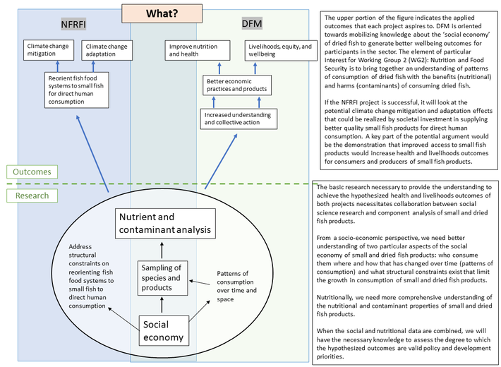 The second figure that I want to show you then adds some content to the first figure. The second figure again moves from basic research to outcomes around the theme of nutrition and social economy. So, in in the basic research box, you see an effort on my part to link our social science research about social economy to the consumption effects of dried fish as food. And so, the core of this basic research is to really figure out who consumes what where and how that pattern of consumption is changing over time. And then by understanding that broader pattern of consumption, what kinds of arguments we can make about the nutritional benefits, but also, the potential health impacts of contamination in dry fish products? And so, then this is in a sense this is part of the working group one’s goal of mapping the relationship between the social dimensions of economic activities and dried fish and the health implications of the consumption of dried fish. So, that's the basic research box. If you go up to the outcomes box then, and I'll focus on the right side, there are policy implications from our research. So, if we can understand the food system of dried fish better than it is currently understood, we should have guidance about what kinds of contaminants exist and how to try to develop systems for reducing those contaminants and dried fish products that can be.