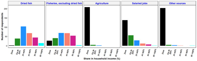 Impacts of the COVID-19 pandemic were strongly felt during the time of the surveys. Therefore, the survey instrument contained questions to capture the impacts of COVID-19 on dried fish processors. Two sets of questions were included. The first set of questions pertained to the impacts on the fisheries operations of the respondents, while the second set of questions included the impacts on their daily life. Figure 31 shows the responses to the questions about impacts on fisheries operations. These questions asked the respondents to rate the impacts respondents felt during COVID-19 compared to normal times. About 71 percent responded that supply of fresh fish declined during COVID-19 compared to normal times. About 60 percent of the respondents felt that the demand for dried fish increased during COVID-19, and about 68 percent felt that the price of dried fish increased during COVID-19. Compared to dried fish, the responses show a stronger increase in demand for and the price of fresh fish. About 82 percent of the respondents felt that the demand for fresh fish increased during COVID-19 and about 85 percent felt that the price of fresh fish increased.