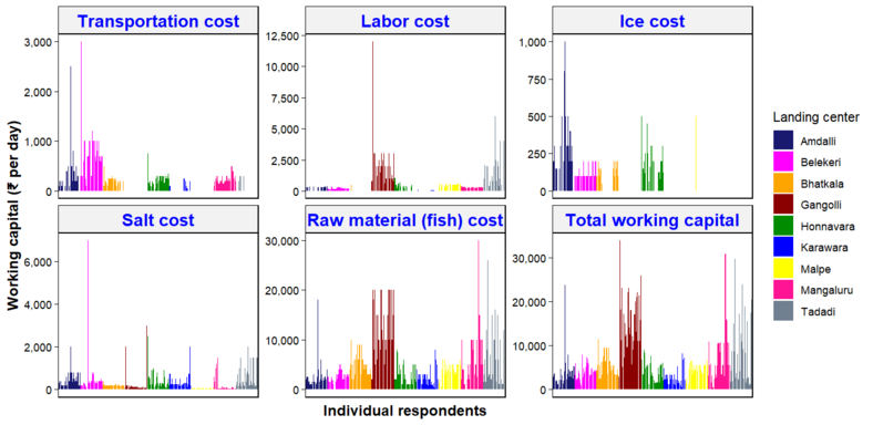 Figure 8 shows the working capital, in this case variable costs, for dried fish operations, by landing center. These responses were sought on a per-day basis, for example, through the question, “Please mention the price paid by you for Working capital- Ice (per day)”. The y-axis of each facet in the figure has different scales. Raw material (fish) forms the largest component of the variable costs. On average, costs of raw material (fish) form about 77 percent of the total working capital, followed by salt (9 percent), labor (7 percent), transportation (5 percent), and ice (2 percent). Raw material costs are higher in Mangaluru (in Dakshina Kannada), Malpe, and Gangolli (in Udupi), thus indicating that Uttara Kannada may have comparative advantage in procuring fish for drying operations at a lower price. In addition, [5, Ramappa et al., 2022] highlight the role of migrant women laborers in dried fish processing. These migrant women act as relatively less expensive labor for the processors, and in return the laborers get a higher wage than what is available to them in their native places.