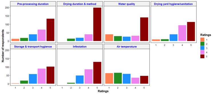 The survey asked the respondents to rate the importance of some variables determining quality in the fish drying process. Figure 23 shows the responses, in which a rating of one (1) indicates no importance and five (5) indicates highest importance. Drying duration and method are considered most important by highest number of respondents. Some of the other important variables are related to hygiene and sanitation (water quality, drying yard, storage and transportation, and infestation). Air temperature is the least important variable for the respondents.