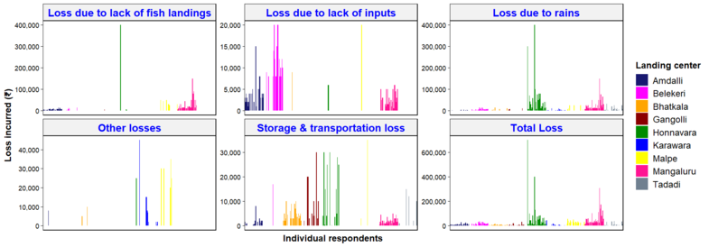 Figure 9 shows the economic losses incurred by the respondents due to different sources, by landing center. It is noteworthy that respondents at Mangaluru and Malpe, two largest fishing harbors of Karnataka, report losses due to lack of fish landings, while such losses are less prevalent at other landing centers. Loss due to lack of inputs is reported mostly in Amdalli, Belekeri, and Mangaluru. Small losses due to rains are reported from most landing centers, but some such instances of loss are quite big in Honnavara and to a lesser extent Mangaluru. Therefore, untimely rains can lead to severe financial shocks for dried fish processors. On average, among the sources of loss considered in this study, the biggest component in the total loss is the lack of raw or fresh fish (about 58 percent of total losses), followed by lack of inputs (26 percent), while untimely rains and losses in storage and transportation result in about eight percent loss each.