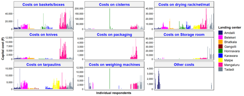 Dried fish production, in the current state of practice in the three districts, does not involve substantial capital investments especially when compared to other common fish preservation technologies such as freezing and canning. The respondents were asked about their investments in terms of necessary capital including the following: baskets/boxes; cisterns; drying rack/mat/net; knives; packaging; storage room; tarpaulins; weighing machines; and other items. Figure 6 shows the landing center-wise responses in terms of monetary value (₹) for each capital item. Each plot (facet) in the figure has different scale on the y-axis for cost (₹). Most common capital costs among dried fish processors are those on baskets/boxes, drying rack/net/mats, knives, and tarpaulins. Overall, larger capital costs on many of these items are observed in Mangaluru, which could be due to the higher production seen there. It could also be due to the relatively higher cost of living in Mangaluru.