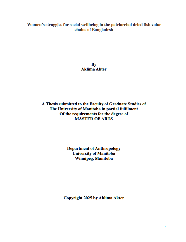 Akter, A. (2025). Women’s struggles for social wellbeing in the patriarchal dried fish value chains of Bangladesh [Master’s thesis, University of Manitoba]